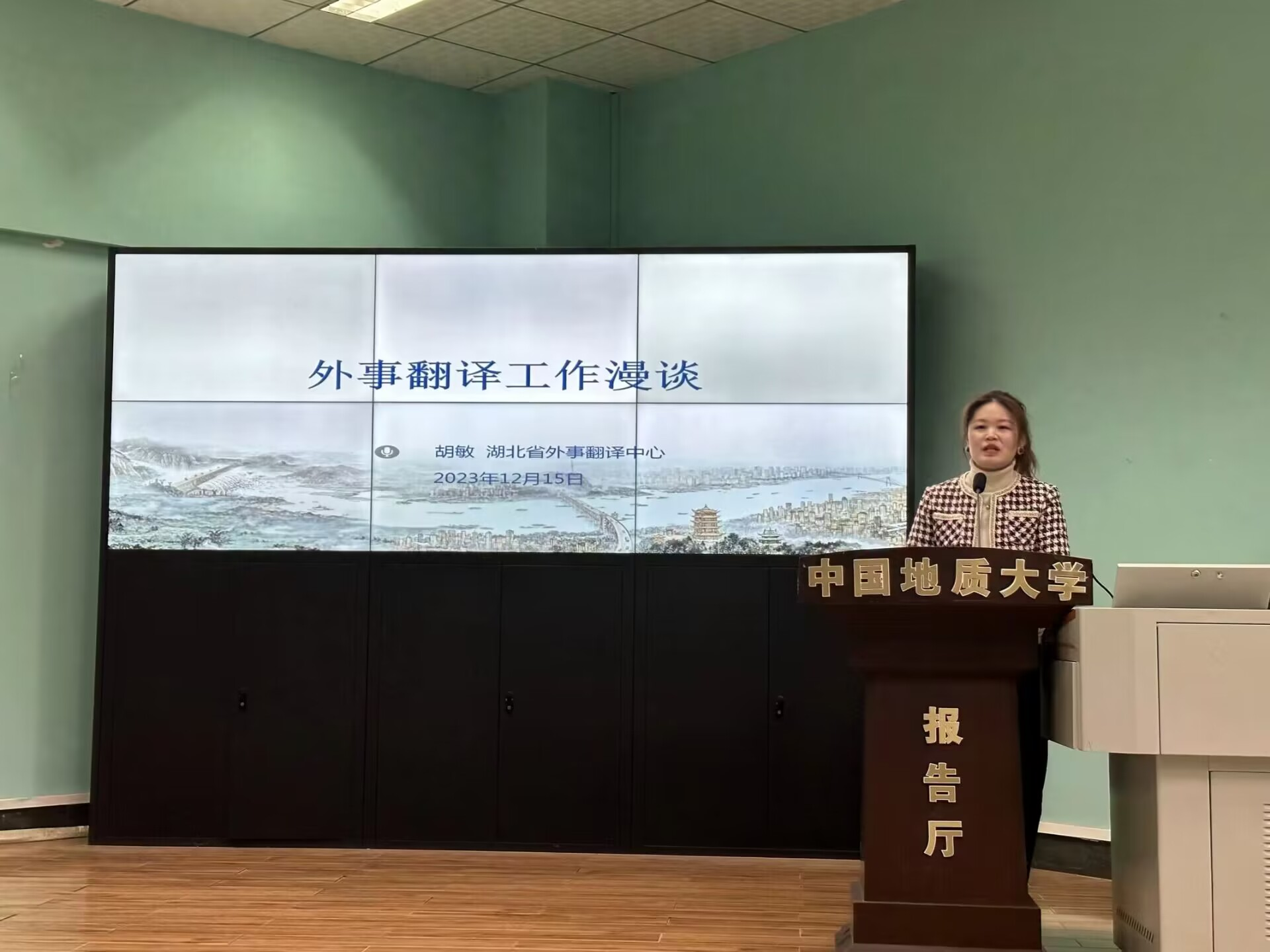 2023年12月15日上午9时00分,德赢VWIN官方网站“南望今声”外语论坛系列讲座第60期在北一楼120学术报告厅举行。主讲人湖北省外事翻译中心英语翻译胡敏女士,应邀开展了主题为“外事翻译工作漫谈”的精彩讲座。此次讲座由德赢VWIN官方网站杨红燕副教授主持,八十余名师生参会。