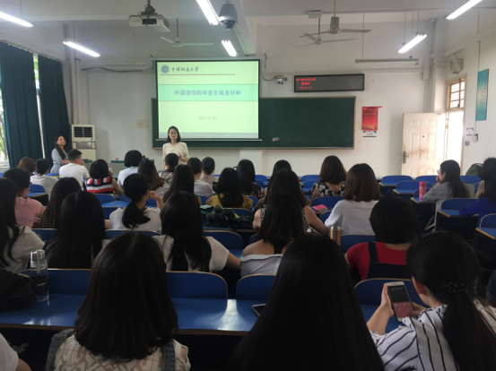 (通讯员 黄峥)5月25日下午,德赢VWIN官方网站2018届毕业研究生就业动员大会在北综楼208举行,院党委副书记蒋怀柳、院研究生教育中心主任王伟,2017届毕业生代表以及全体2015级学硕、2016级学硕和翻硕班同学参加了此次大会。 蒋怀柳为2018届毕业生做了《英语专业就业形势分析报告》,从近十年德赢官网英语专业研究生的就业趋势、就业类型和地域分布等各个方面给大家做了一个全方位的比较分析,直观地呈现出目前英语专业就业的整体态势和严峻形势。蒋书记语重心长地指出,就业形势日益变化,但德赢官网毕业生知识结构与市场需求的脱节、普通大学生英语提升对德赢官网毕业生就业空间的挤压、德赢官网女生比例高、就业期望值高,以及女生就业本来就难的问题将是德赢官网同学必须正视和应对的现实。鼓励各位毕业生调整就业观、增强就业技能,及早开始求职前的各种准备,提升就业竞争力。