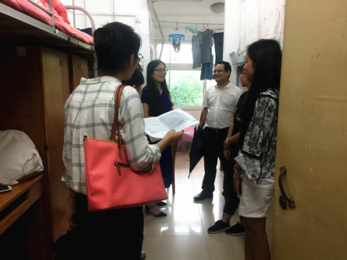 9月4日上午,学院党委书记张基得,研究生教育中心主任王伟,学工组李海涵到东区1栋、2号公寓走访研究生新生宿舍,了解新生住宿情况。2号公寓是学校周转房改造的学生宿舍,张书记仔细查看了宿舍情况,并希望研究生能够克服生活困难,专注学业。