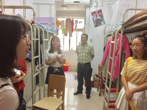 9月3日下午,学院党委书记张基得,学工组李海涵、宁蒙,学院学生会主席沈永强,2017级助理班主任来到北区学生宿舍19栋和21栋走访本科生新生宿舍。张书记详细了解了学生目前的住宿情况,与每位新生和家长交谈。来到19栋510时,张书记看到一位新生还没有被褥等生活用品,经过询问得知是家里寄来的生活用品还没有到,张书记立即打电话联系学校相关部门解决问题。在寝室走访过程中,张书记看到了学生会制作的安全提示,肯定了学生会的工作,希望学生会能够继续将工作切实开展在学生身边。