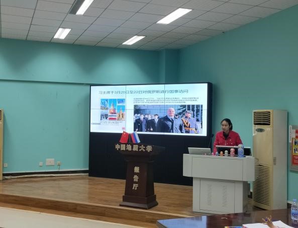 德赢VWIN官方网站外国语言文学研究生党支部党员代表钟舒琪进行了以《和熊猫一起走近俄罗斯》为题的宣讲,介绍了俄罗斯国情、中俄交往历史、中俄外交成果、中俄熊猫外交趣事等内容,并进行了简单的俄语教学。该同志发挥了作为俄语学生的专业素养,在提前准备宣讲材料的基础上,借助视频、图片、小游戏、特色纪念品发放等途径,为参加活动的师生普及了中俄相关的知识,用“一段介绍视频、一个外交故事、一件特色物品、一句本土名言”为听众生动、形象地展现了中俄“一带一路”建设的过程和成果。活动中,观众们积极参与问答及俄语教学,现场反映热烈。