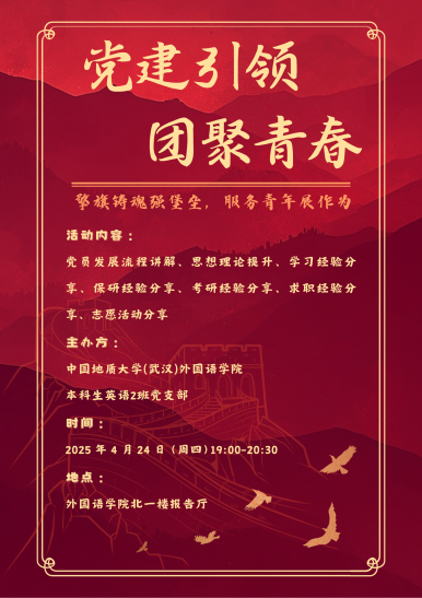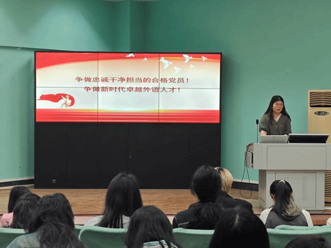 2025 年 4 月 24 日晚 19:00至20:30,德赢VWIN官方网站本科生英语2班党支部于北一楼报告厅举办 “擎旗铸魂强堡垒,服务青年展作为——党建引领・团聚青春”主题联动大会。本次活动以强化党建带动团建作用、服务青年成长为核心,通过理论学习、经验分享等形式,凝聚青年力量,筑牢思想根基。本2支部党员代表及2024级全体本科生共同参与。