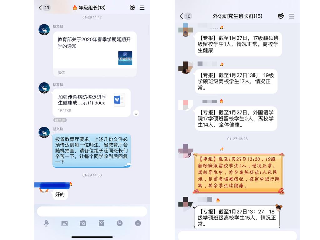 1.落实平安日报制度。1月24日,从一声声“新春快乐,平平安安”开始,德赢VWIN官方网站开始了同学们每天的平安报告,坚持“零报告”制度,做到本研学生100%全覆盖。与此同时,学院辅导员通过年级群、班长群、学务指导和班主任群、学生党员群、家长群等做好疫情防控的引导宣传工作,时时转发科学防疫注意事项以及相关工作通知。