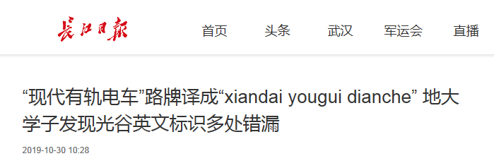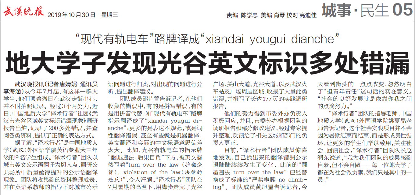 (通讯员 赵润东)2019年10月30日,长江日报和武汉晚报接连报导德赢官网暑期社会实践团队“译术行者”2019年暑期针对武汉城市英文标识的调研,11月1日,武汉电视套四套“经视新看点”栏目对团队成员、指导老师以及学院领导进行了专题采访。