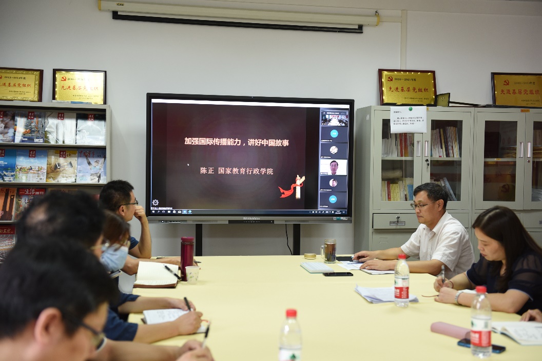 (通讯员杜冬琴、邓维 摄影 戴薇)2022年8月27日下午,作为学院新学期工作研讨会活动之一的 “南望今声”外语论坛第35期在德赢VWIN官方网站北一楼102会议室举行。应学院党委书记刘世勇邀请,国家教育行政学院教育领导与管理国际比较研究中心主任陈正副教授在线上为德赢官网师生做题为“加强国际传播能力,讲好中国故事”的报告,报告由刘世勇主持,学院师生线上线下近200人参与学习交流。