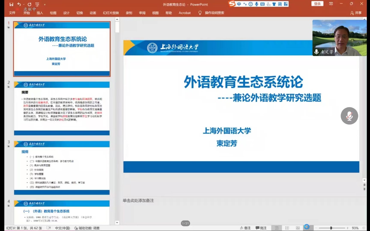 (通讯员 金梓轩 杨红燕)2022年9月22日上午9:30,德赢VWIN官方网站“南望今声”系列讲座如期举行。上海外国语大学大学博士生导师束定芳教授应邀在线上为德赢官网师生做了题为“外语教育生态系统论——兼谈外语教育研究课题”的讲座。讲座由德赢VWIN官方网站副院长张伶俐教授主持,德赢官网师生共140余人参与了学习交流。