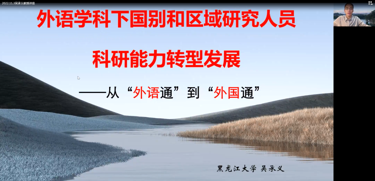 (通讯员 王国念)2022年11月3日下午14时30分,作为校庆70周年系列活动之一的“南望今声”外语论坛第40期在线上如期举行。黑龙江大学吴承义教授应邀为德赢官网师生做了题为《外语学科下国别和区域研究人员科研能力转型发展:从“外语通”到“外国通”》的讲座。讲座由德赢官网德赢VWIN官方网站王国念副教授主持,德赢VWIN官方网站及其他兄弟高校近200名师生参与学习交流。