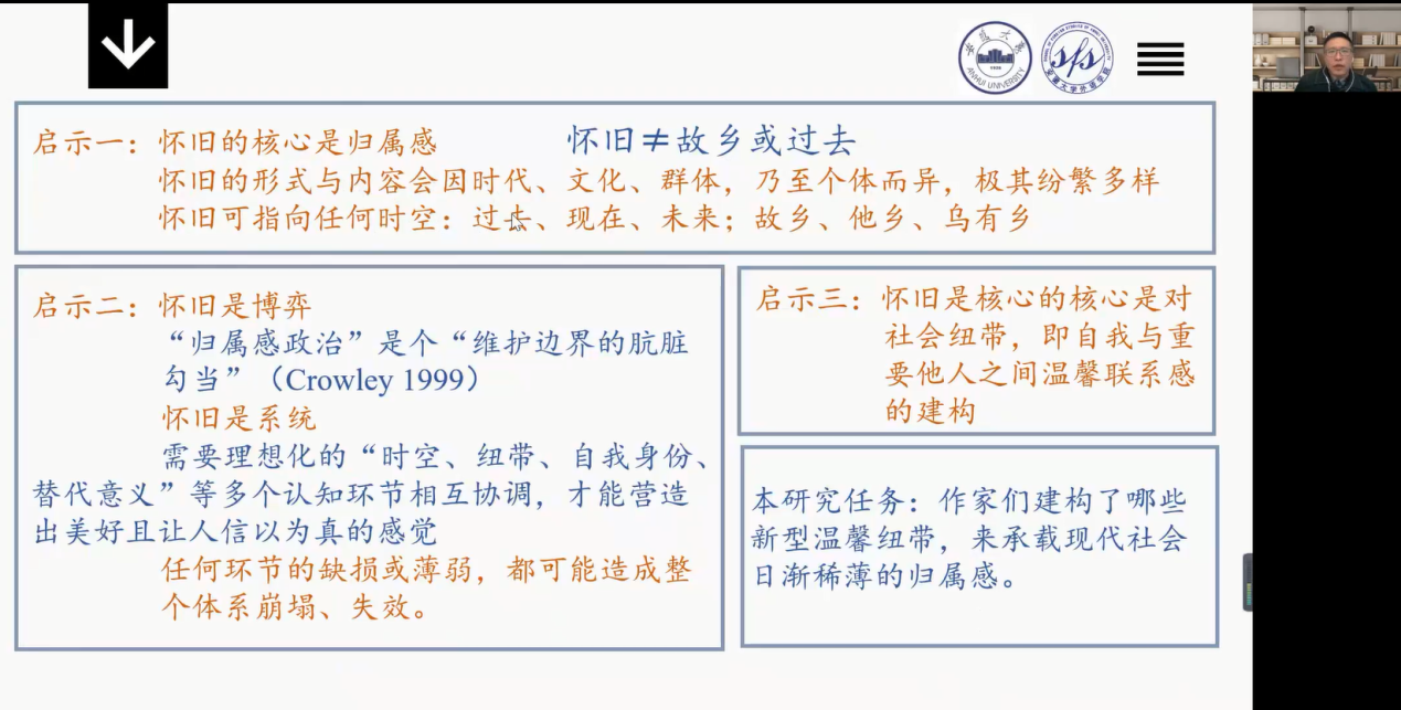 戚涛教授在讲座中首先指出归属感是人类的基本需求,而怀旧是归属感的补偿机制,是一种居于现代世界核心位置的情感。进而以影视作品中的人物对话为例,展现了美国主流文化中的竞争性自治原则,所造成的缺乏社会联系、难寻归属感等社会问题,在此氛围下,乡愁成为了19世纪美国普遍而高涨的社会情绪。