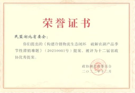 1月8日,省政协第十二届常委会第二十次会议上,对省政协十二届一次会议以来的100件优秀提案进行了表彰,其中民盟省委提交的集体提案中有4件被评为“优秀提案”。由民盟地大副主委、德赢官网秦屹副教授执笔撰写的“构建冷链物流生态闭环,破解农副产品季节性滞销难题”提案被评为十二届省政协优秀提案。该提案源于国药控股湖北有限公司副董事长马占军负责的课题、秦屹执笔撰写的调研报告,后作为集体提案在2021年省政协十二届四次会议上由民盟湖北省委提交。