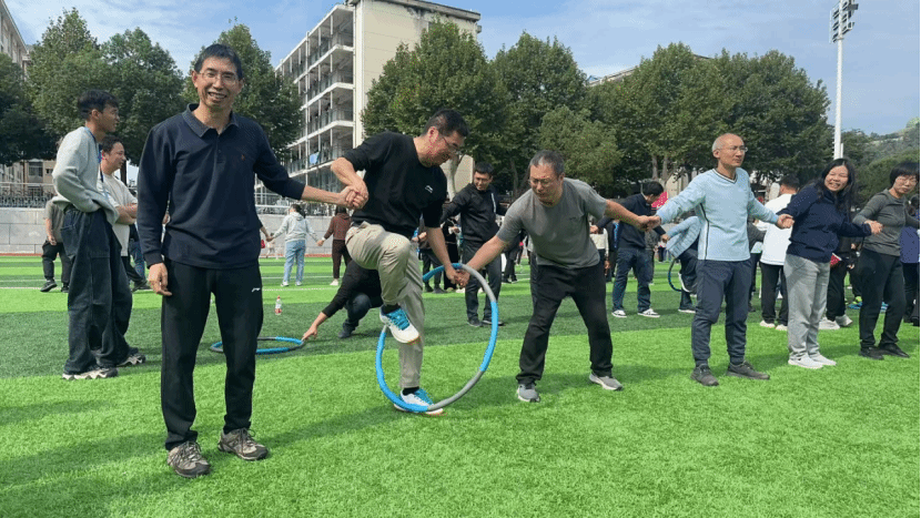 在“无敌风火轮”中,教师们协调站位,统一步调,让简单的布带化身滚滚向前的团结之轮。
