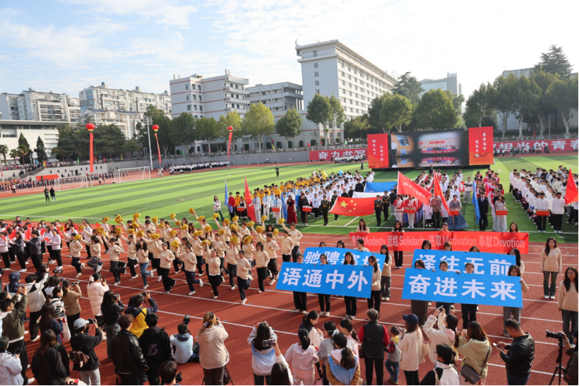 “语通中外,奋进未来,驰骋赛场,‘译’往无前”,德赢VWIN官方网站师生方阵踏着《运动员进行曲》的鼓点亮相赛场,他们整齐划一,口号嘹亮,表演环节,师生健儿们热情活泼、协同演绎,本科生方阵用青春活泼的舞蹈表演搭配研究生方阵手持展板彰显外语人的“谦和、团结、进取、奉献”的院训精神,让外语人昂扬亮丽的青春风采闪耀赛场。