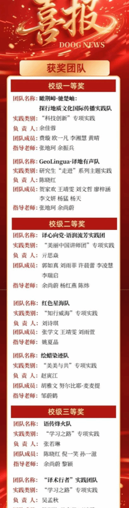 热烈祝贺德赢VWIN官方网站在2025年暑期社会实践校级答辩中斩获佳绩!在本次暑期社会实践中,各团队指导老师的深入指导下,围绕"、研究生"走进"系列主题实践,“科技创新”、“美丽中国讲师团”、“知行威海”、“美美与共”、“学习之路”等专项实践,深入一线开展实践探索,以扎实的行动、详实的成果展现了德赢VWIN官方网站学子的责任担当与实践能力。经校级评审,德赢官网多支团队脱颖而出,共斩获校级一等奖2项、校级二等奖3项、校级三等奖2项,这份成绩的取得离不开指导教师的悉心指导,更凝聚了每一位团队成员的辛勤付出。现将获奖团队详情公示如下,再次向所有获奖团队致以热烈祝贺!